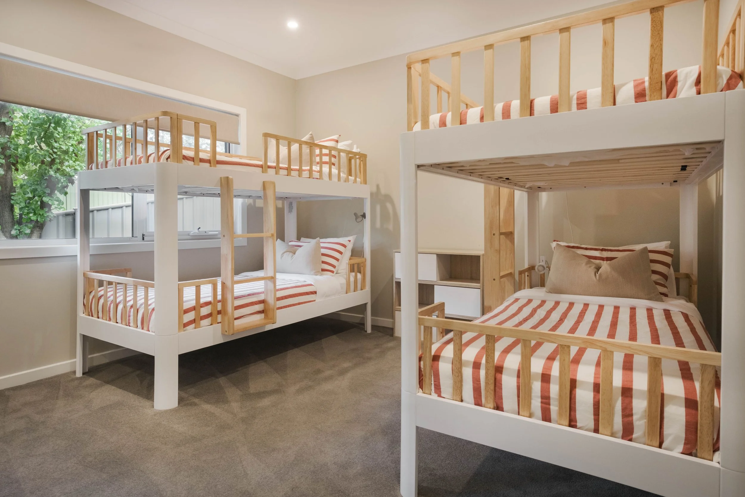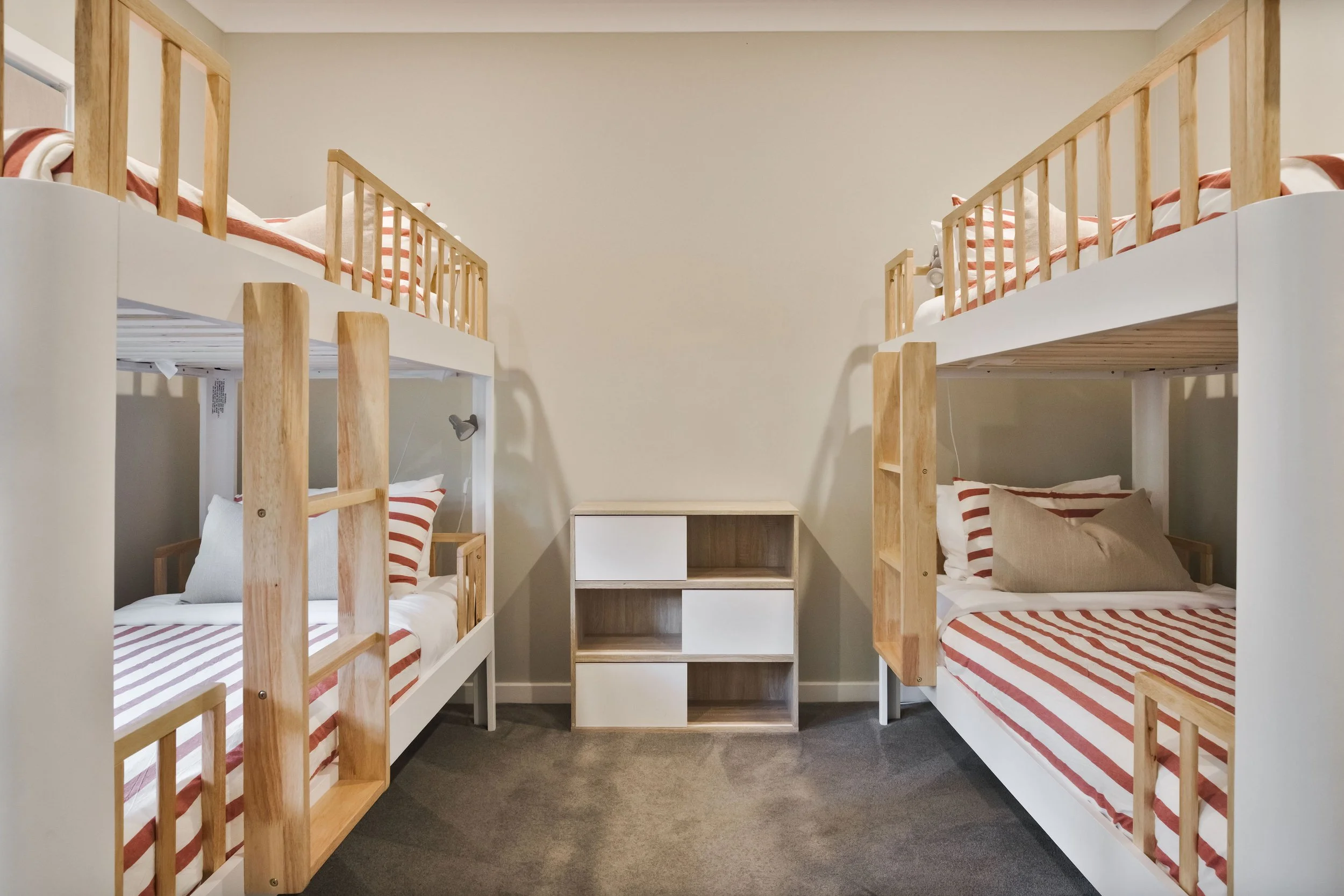 The second bedroom contains a queen bed, and the third bedroom has two sets of quality single bunks, all of which offer premium amenities and luxury linen.