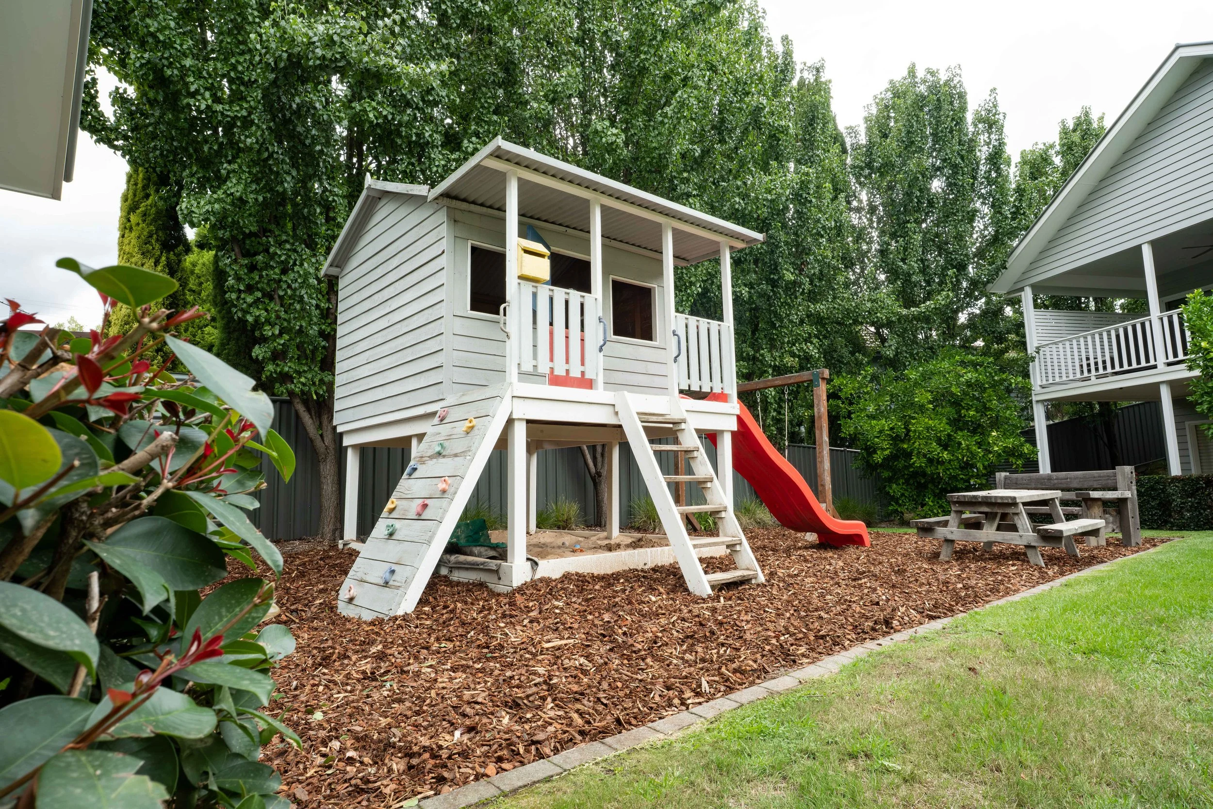 Across from the large alfresco area is a kid’s haven, with plenty of things to keep them busy, including a gorgeous cubbyhouse, sand pit and swing set – all visible from any of the homes.